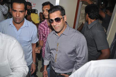 Salman caused a flash frenzy as he arrived. He was wearing gray long sleeve Being Human dress shirt, blue jeans, and brown sunglasses.
